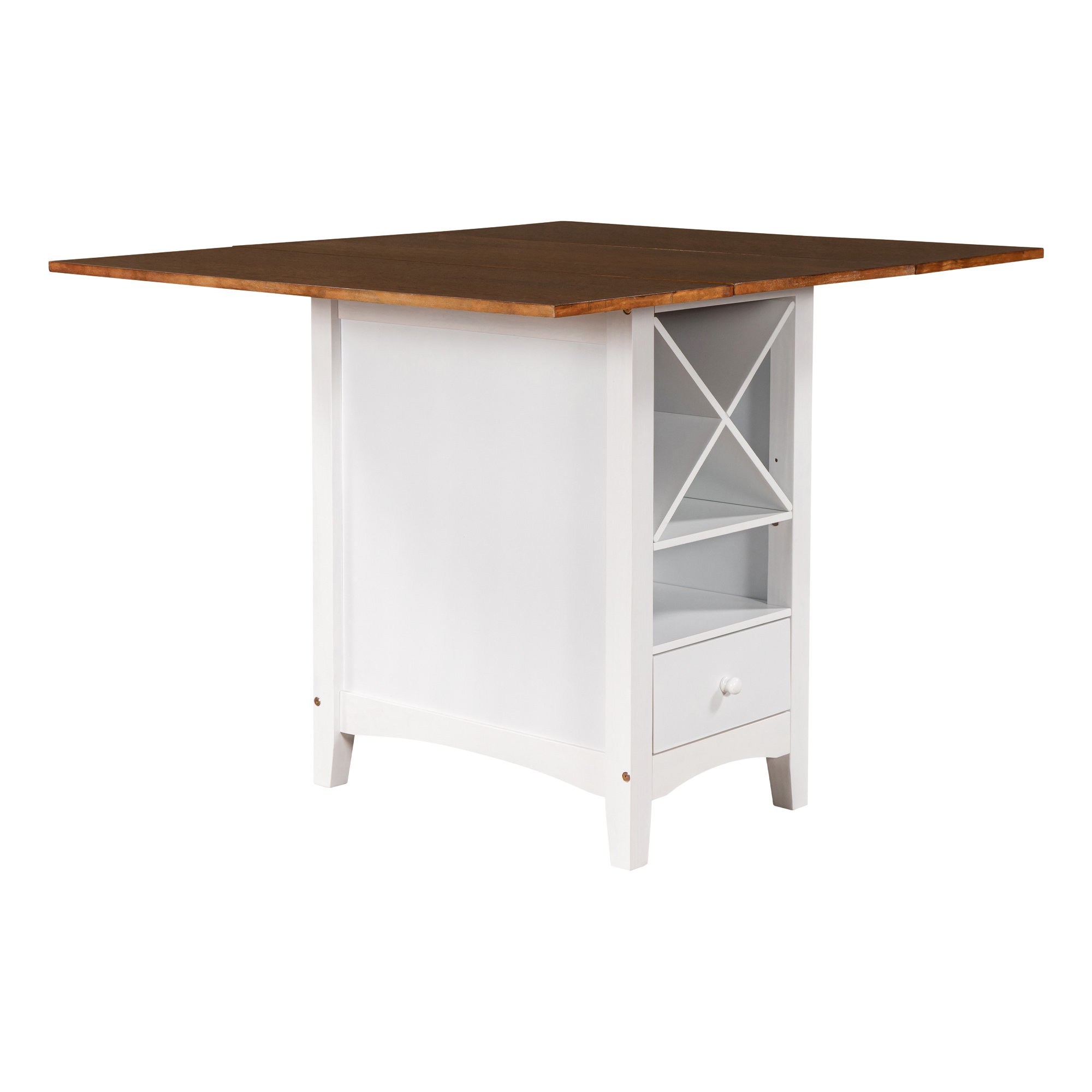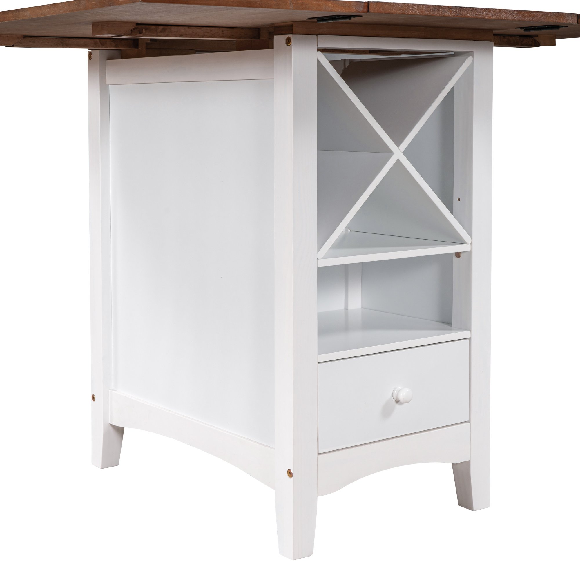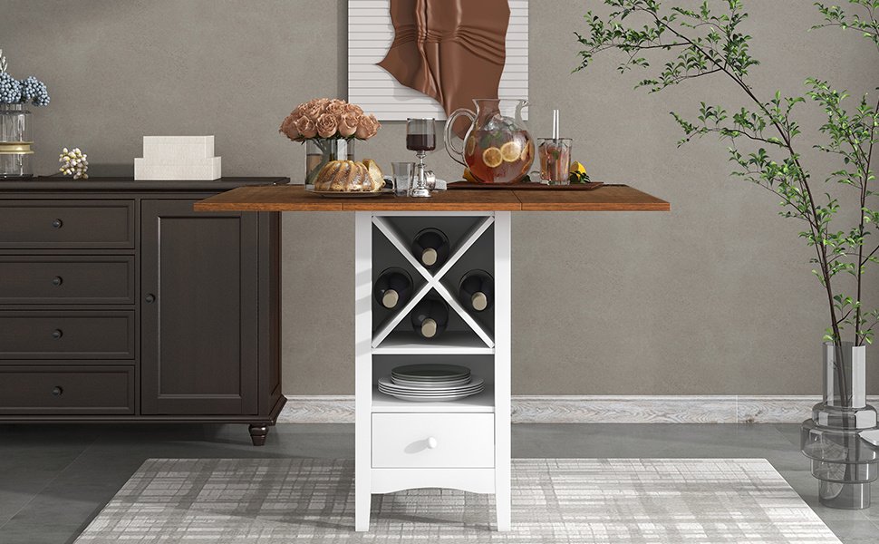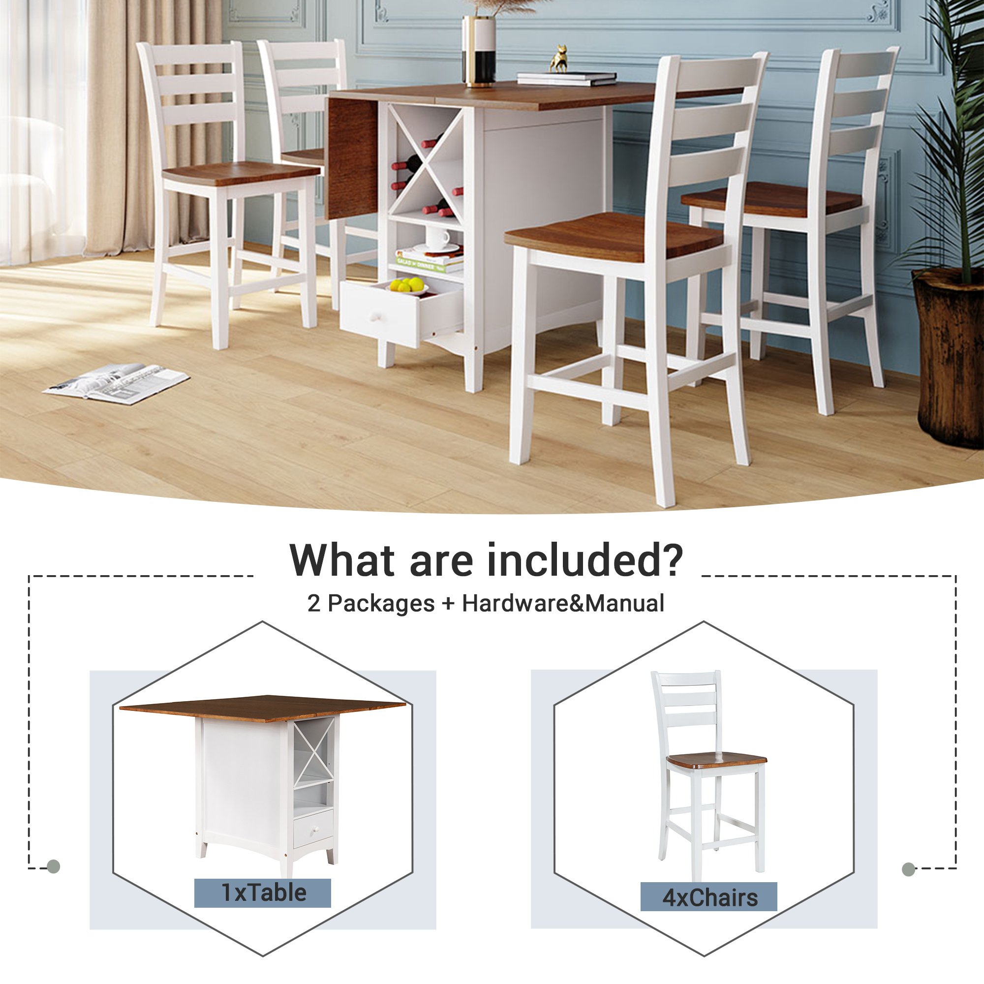 Farmhouse Wood Counter Height 5-Piece Dining Table Set with Drop Leaf; Kitchen Set with Wine Rack and Drawers for Small Places
